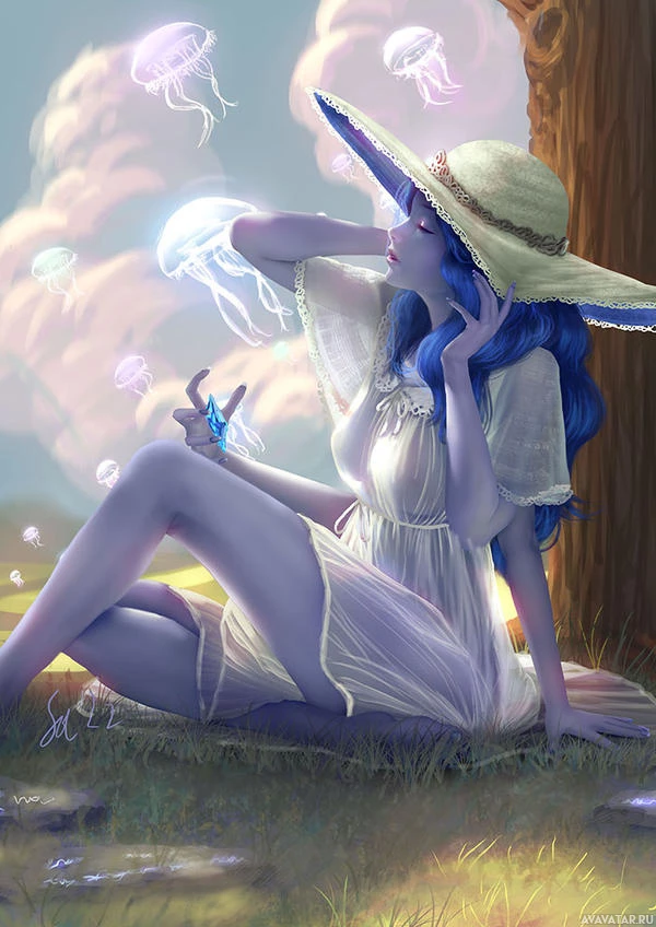 the video game "Elden Ring." She is depicted sitting on the ground, leaning against a tree, and holding what seems to be a jewel or crystal in her hand. Around her are floating jellyfish that could be magical creatures or part of