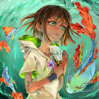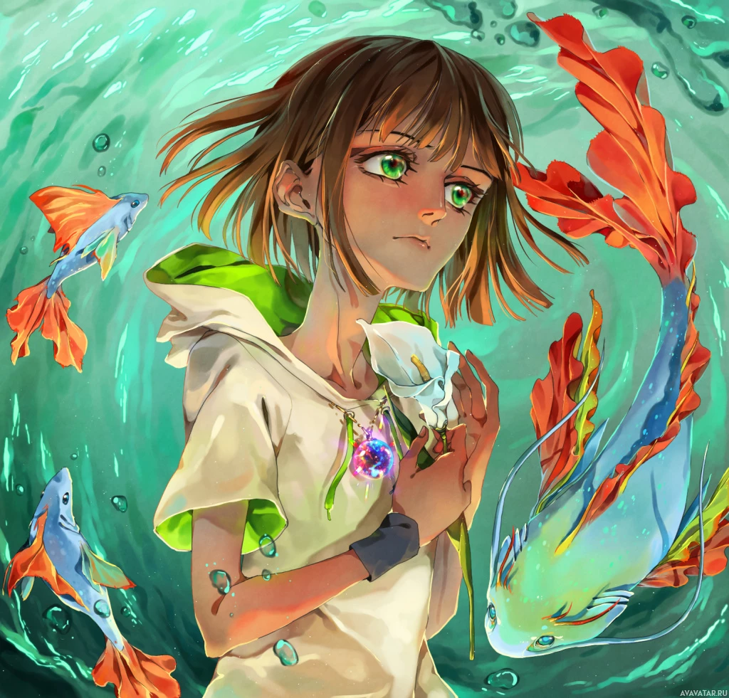 vibrant fish that are swimming in the ocean around her. The fish come in various colors and sizes, adding to the lively atmosphere of the scene despite the girl's