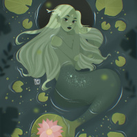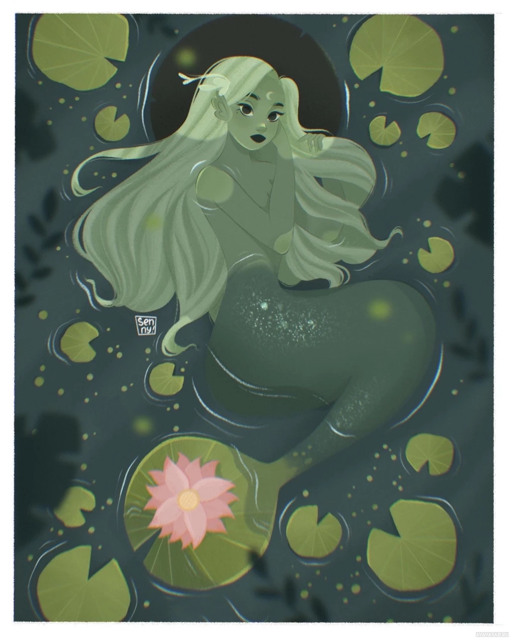 lily pads in water, surrounded by dark foliage, which creates a nocturnal or underwater ambiance. There is a moon visible overhead, suggesting it might be nighttime. The artwork is detailed with shading and highlights that give depth to the scene.