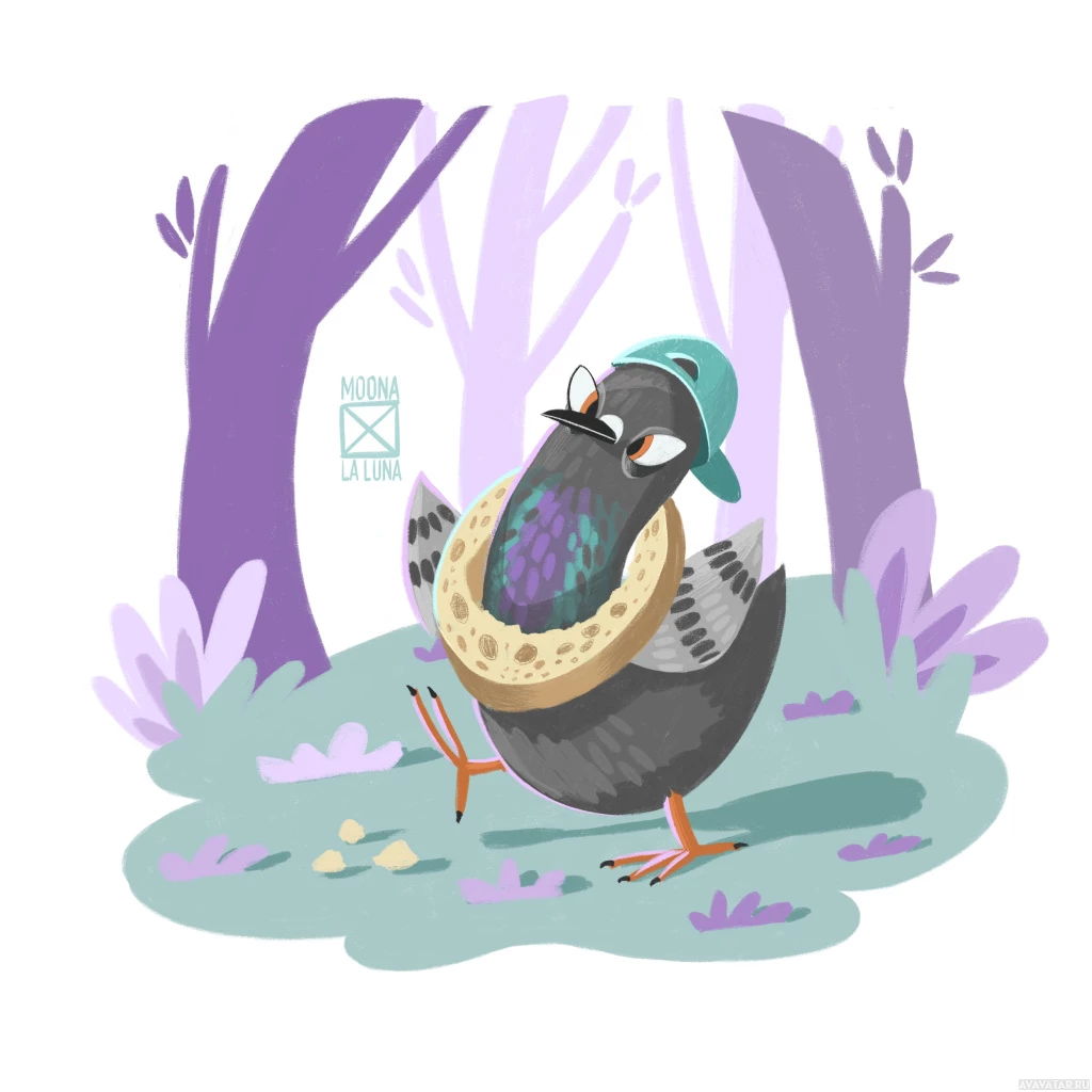 a cartoon bird, which appears to be a pigeon or similar species, wearing sunglasses and a hat. It is holding