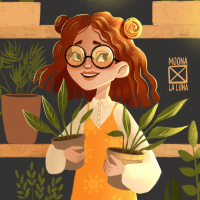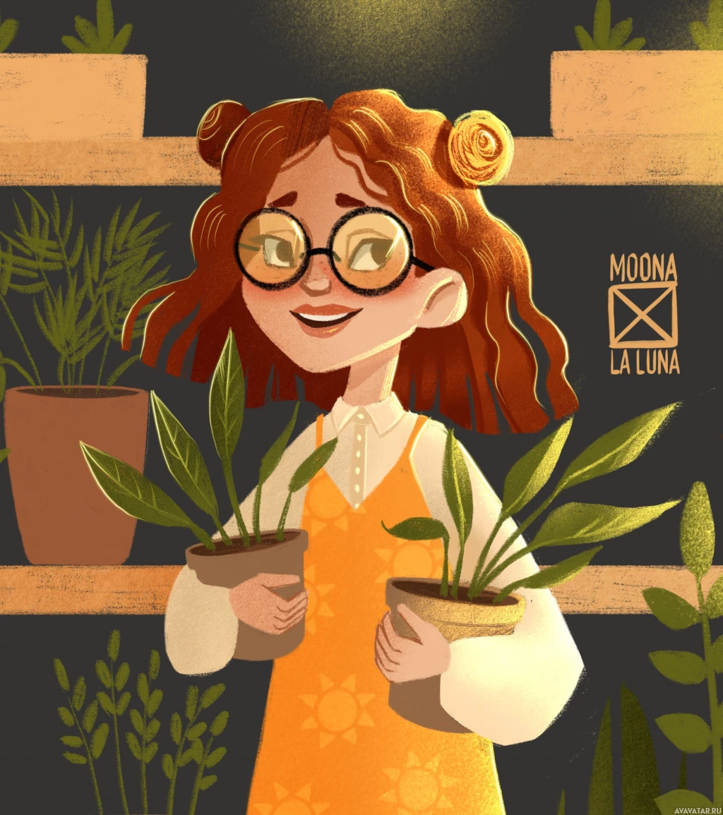 an indoor gardening or plant nursery environment, and the artwork has a whimsical, colorful style.