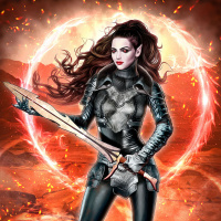 the fantasy genre, depicted as a warrior or fighter. This character is holding a sword in one hand and is wearing what appears to be armor or