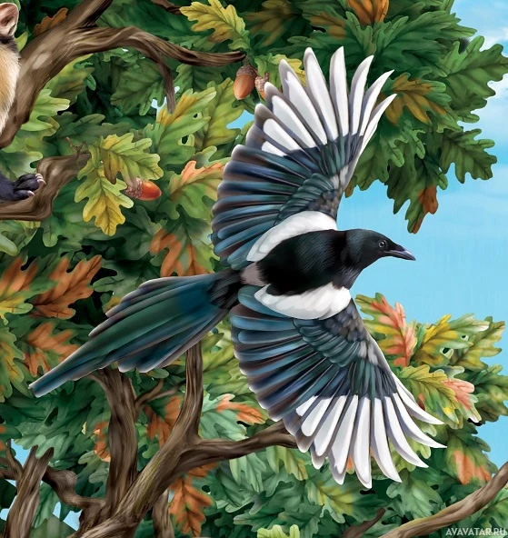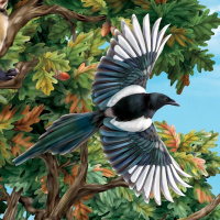 The image shows a bird, specifically a type of starling with white and black feathers, spreading its wings wide. In the background, there are branches with leaves that suggest it could be a tree in