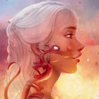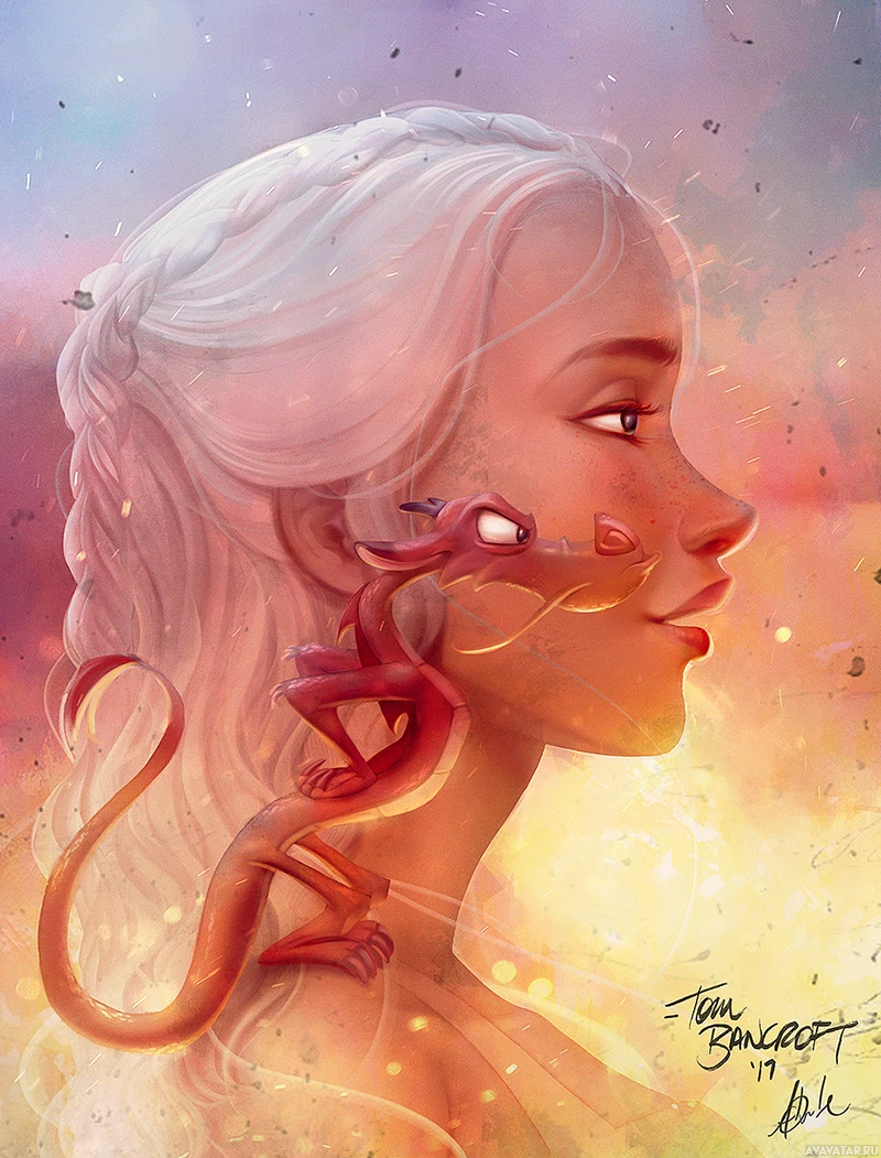 blonde hair, who appears to be from the "Game of Thrones" series, given the reference to Daenerys Targaryen. There are three dragons perched on the character's shoulders. These dragons have