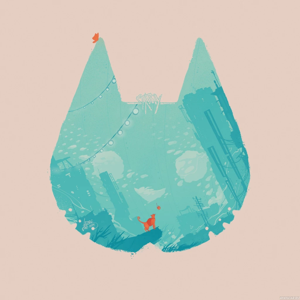 the video game "Stray." The cat is depicted with human-like features and is standing on what looks like a bridge or platform over water. In the background, there are various elements that suggest a post-apocalyptic or abandoned environment. The artwork uses