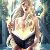 an open book in her hands, as if she is reading or casting a spell from it. There are magical elements around her: