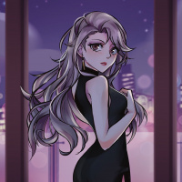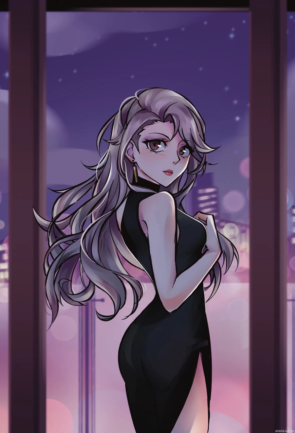 a black dress and stands in a doorway at night, looking out into the cityscape with lights that suggest it might be evening or nighttime.