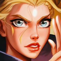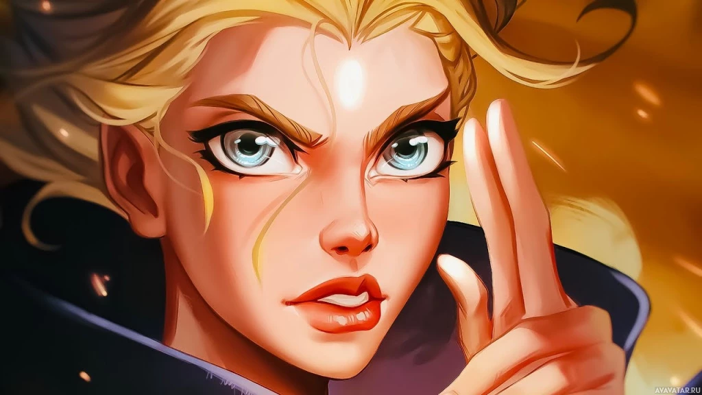 blonde hair and striking blue eyes, giving her a dynamic and intense look. Her expression is one of determination and focus, as indicated by her facial features such as the slightly furrowed brows, gritted teeth, and