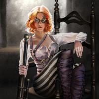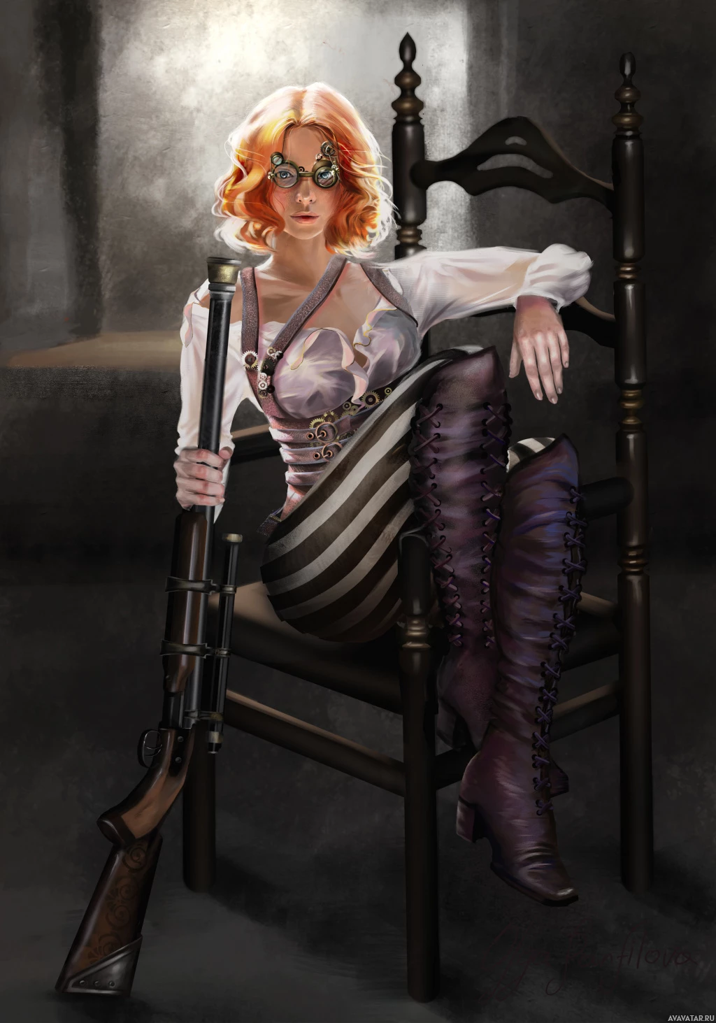 The image depicts a red-haired girl sitting on a chair, wearing a costume with a pirate theme. She is holding two guns, one in each hand. Her attire suggests she might be portraying a character from historical or fantasy settings, where such clothing and weaponry could be typical for