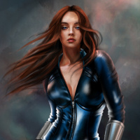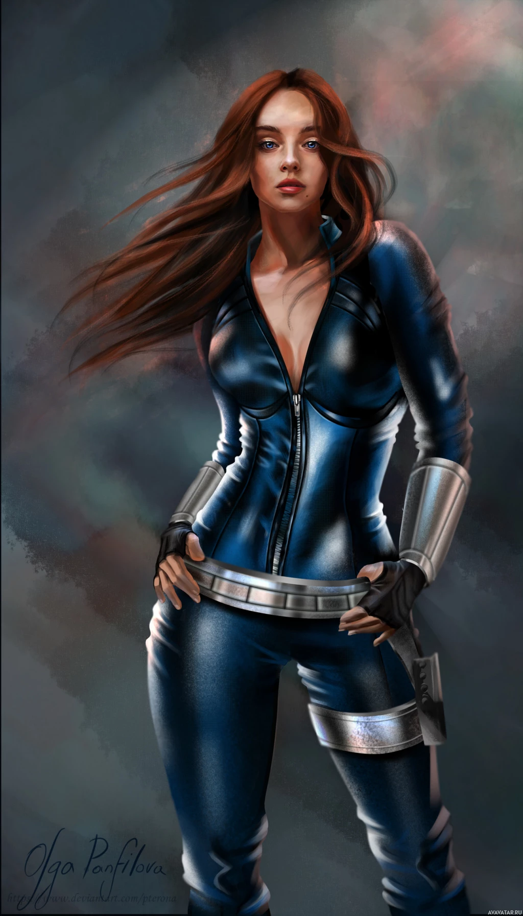 a female character with red hair, dressed in a black and silver costume that resembles the outfit of a superhero. She has her hand resting on her hip and appears to be posing confidently against a background that suggests