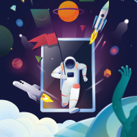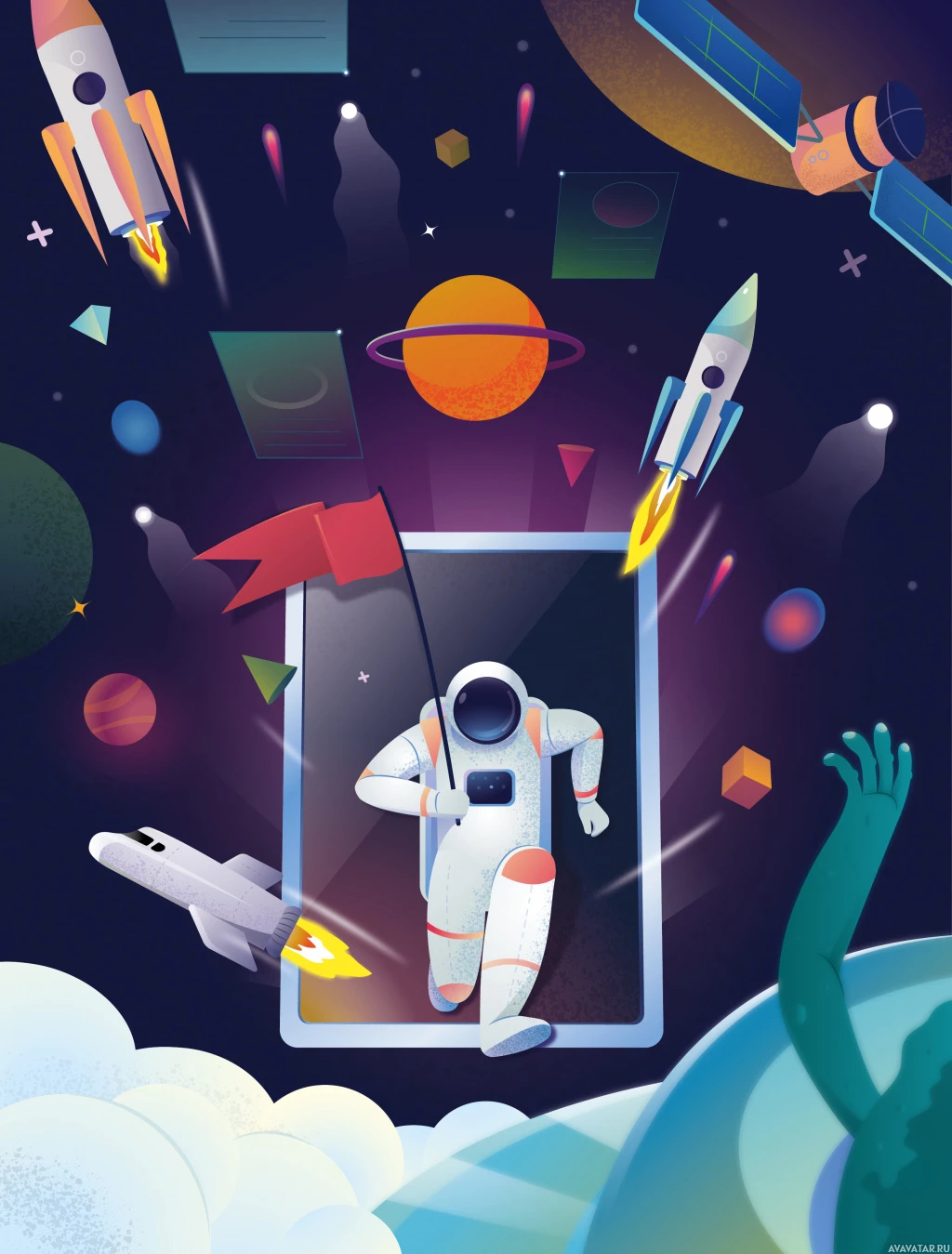 a space suit, depicted as walking on the moon or another celestial body. The background is filled with various space-related elements such as planets, stars, rockets, and other astronauts, creating a vibrant and dynamic space theme. It seems to celebrate exploration and the achievements of human
