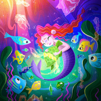 The image features an illustration of a mermaid surrounded by various