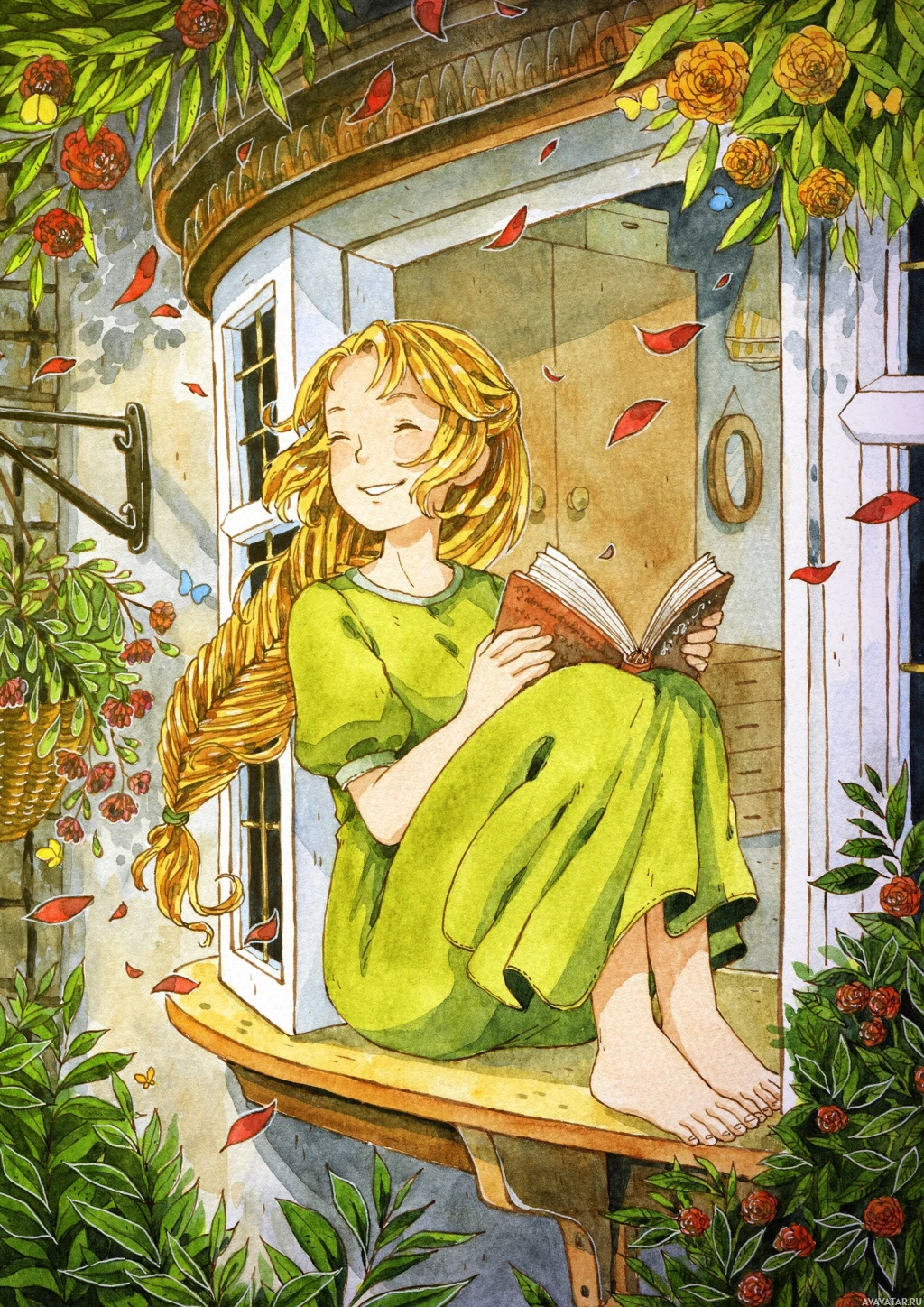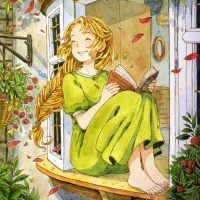 blonde hair, wearing a green dress, sitting by an open window. She has her eyes closed and is smiling as she reads a book. The scene suggests