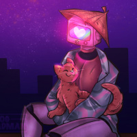 The image shows an illustration of a character that resembles a robot, holding a cat. The setting appears to be a nighttime cityscape with buildings and stars in the sky. The style of the artwork suggests it could be related to the video game "Stray."