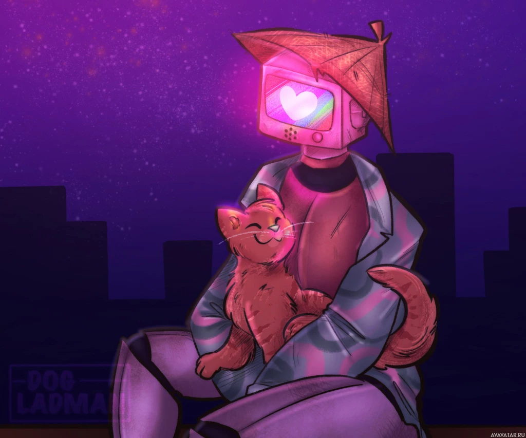 На картинке изображен персонаж, похожий на робота, держащего на руках кошку. Декорация представляет собой ночной городской пейзаж со зданиями и звездами на небе. Стиль оформления позволяет предположить, что это может быть связано с видеоигрой "Stray".