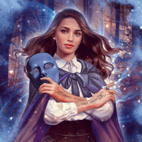 The image features a girl wearing a mask and a cloak. She is holding what appears to be a mask in her hands, which is part of the character she's portraying. The background suggests a mystical or supernatural setting with elements that could represent a forest or a dark path at night. The artwork has a fantasy theme and may be related to characters from mythology or folklore.