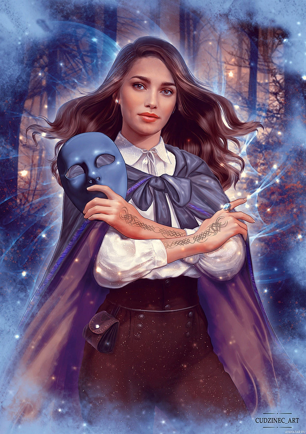 На картинке изображена девушка в маске и плаще. В руках она держит что-то похожее на маску, которая является частью персонажа, которого она изображает. Фон предполагает мистическую или сверхъестественную обстановку с элементами, которые могут представлять лес или темную тропинку ночью. Произведение искусства имеет фантастическую тематику и может быть связано с персонажами мифологии или фольклора.