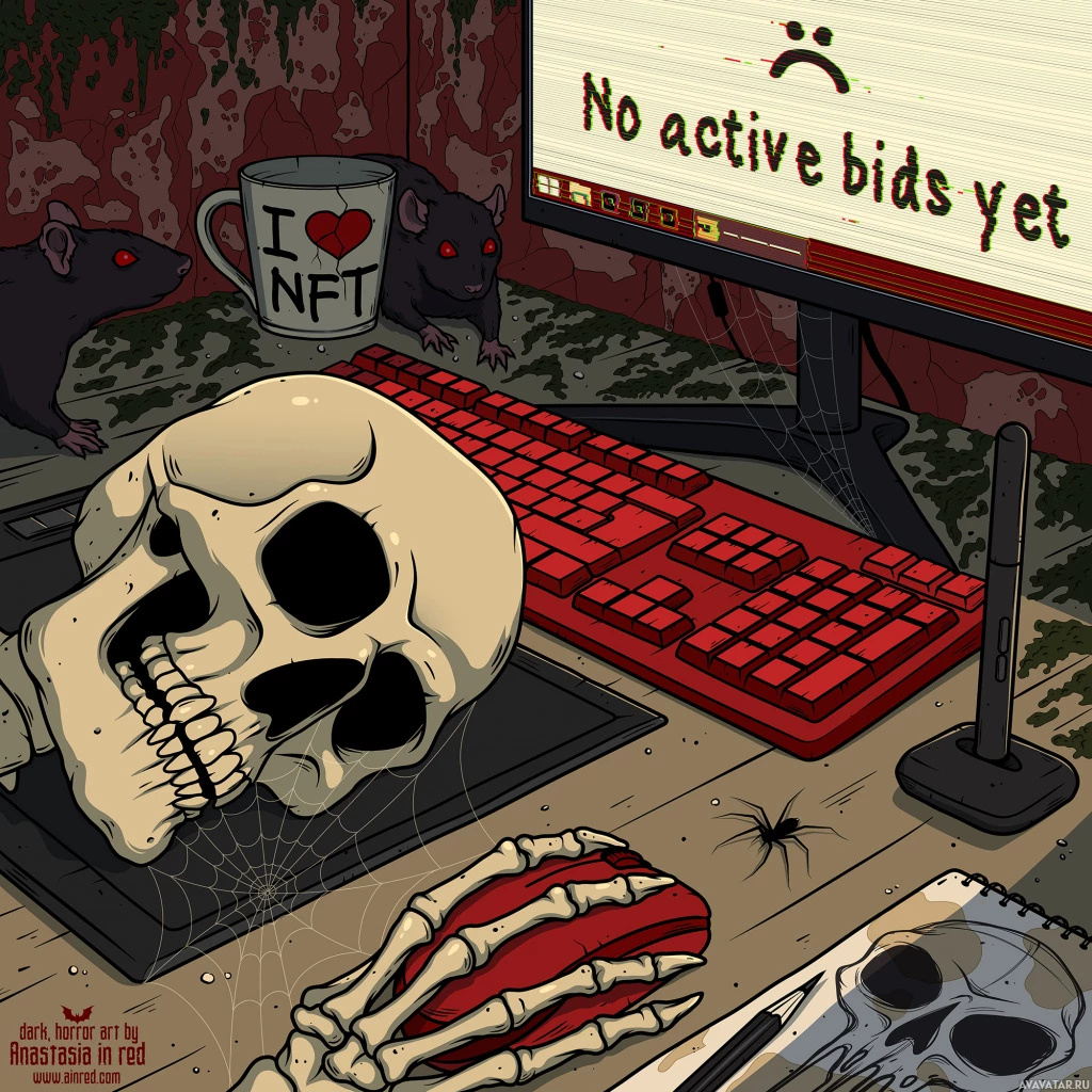the computer screen reads "NO ACTIVE BIDS YET", indicating that this could be from an online auction platform where users place bids on items for sale. 5. The overall color palette and style of the illustration suggest it is a piece of digital art or animation designed to convey humor or satire.
