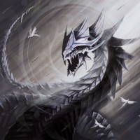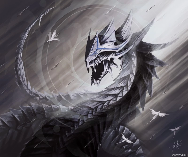 intricate armor and designs on its body and head that suggest it could be from a story or video game with fantasy elements. It stands in the center of the frame with its mouth open as if roaring or shouting. The background appears to be stormy, adding
