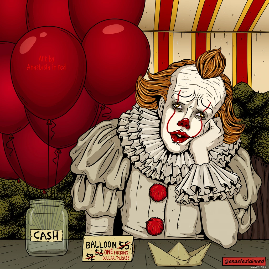 film series "It" by Stephen King. This character is known for his menacing appearance as a clown and is often seen with balloons, which are present in this illustration. The character is seated at a table with balloons floating around him, suggesting a festive or celebratory event. There are also prices listed next to the character, indicating that he might be offering balloons for sale.