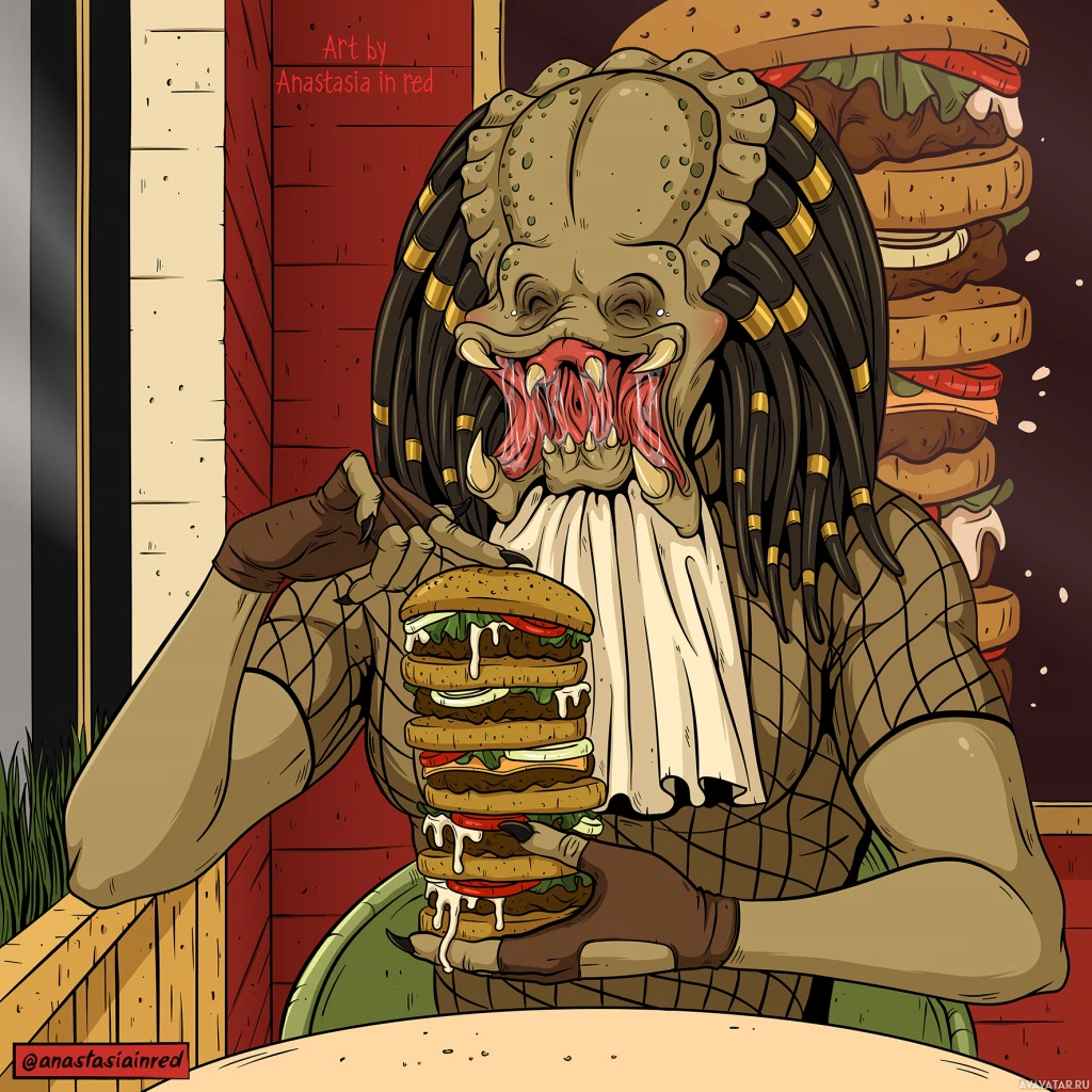 iconic mask and bladed armor, sitting at a table in what appears to be a fast-food restaurant. The Predator is eating two hamburgers stacked on top of each other. The scene has been humorously set up to showcase the Predator's ability to consume large amounts of food or perhaps as a commentary on fast-
