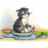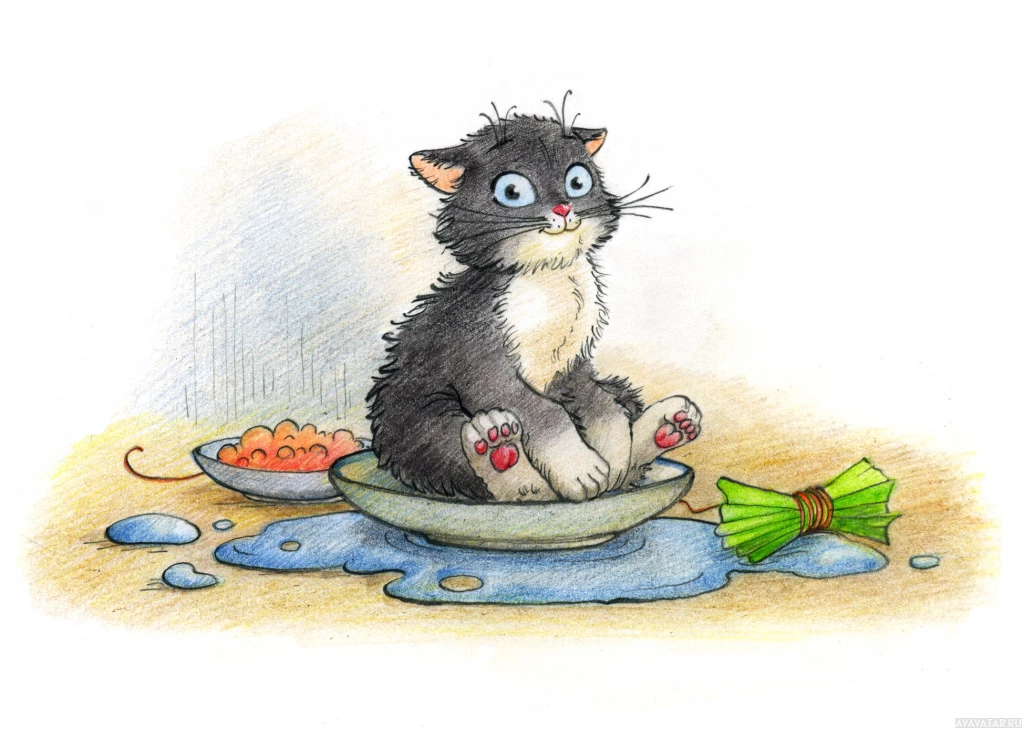 The image shows a cute cartoon-style kitten sitting in