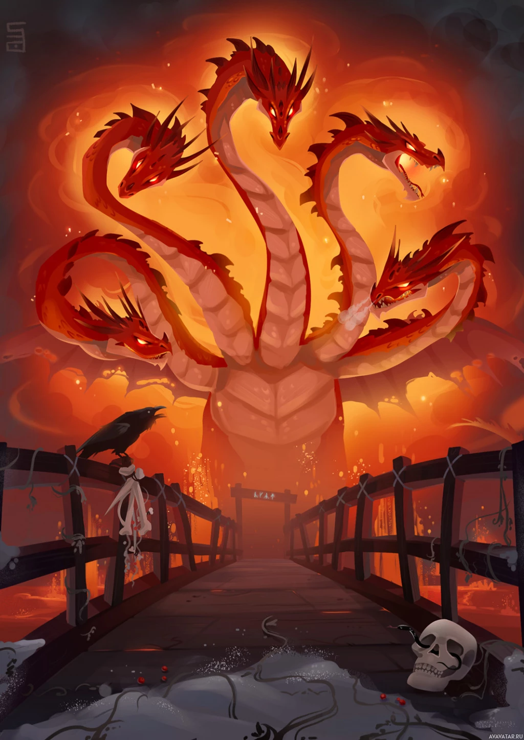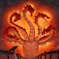 a large dragon with multiple heads, emitting fire from its mouths and surrounded by a fiery aura. The dragon appears to be in
