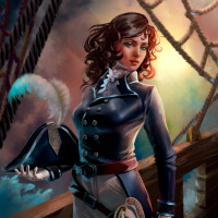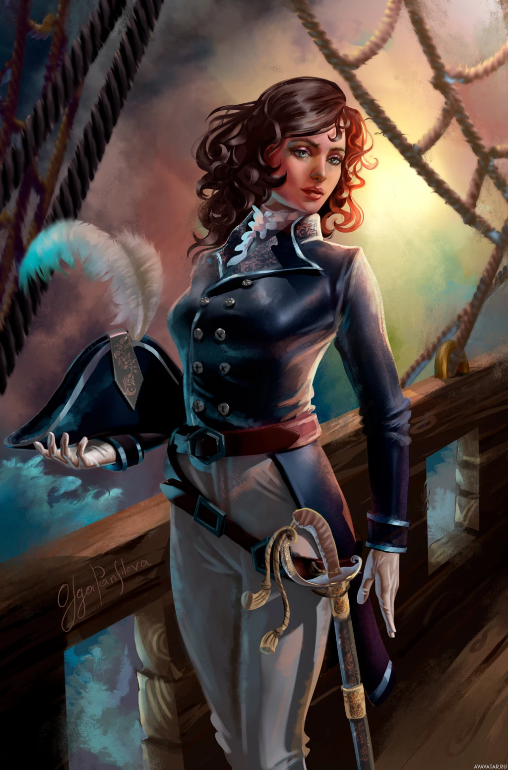a hat with a feather, and has a sword slung over her shoulder. The background suggests a nautical setting, possibly a ship deck during