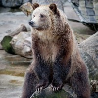 a brown bear. It appears to be sitting on some rocks near water, possibly in