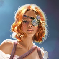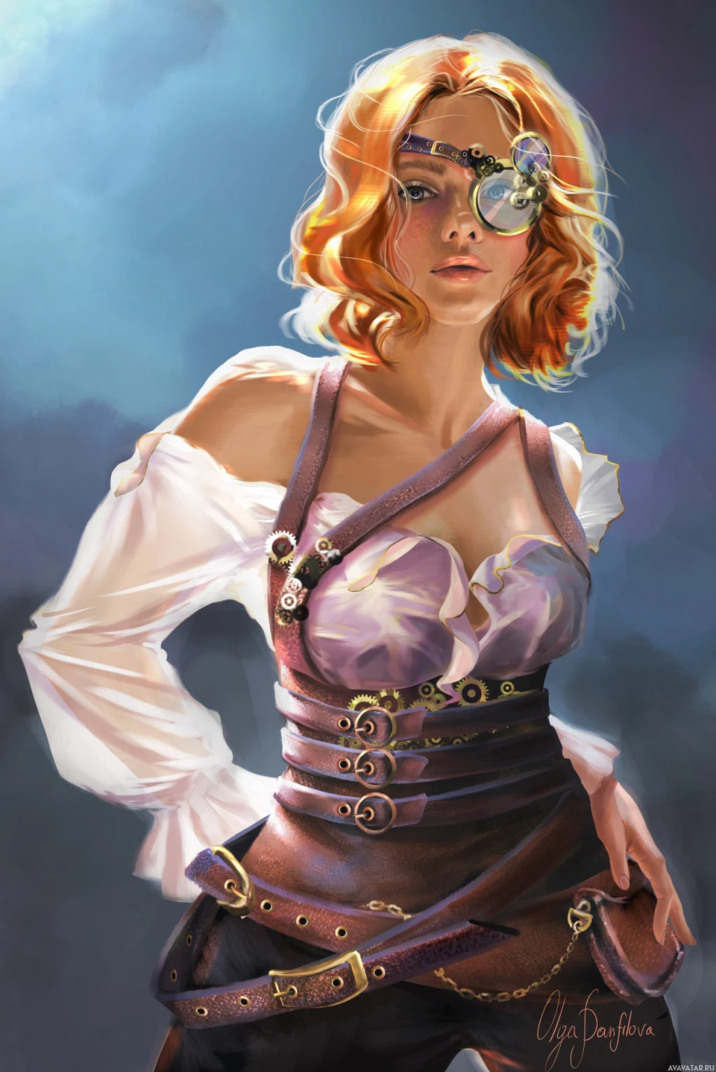 red hair, is wearing eyeglasses with round frames, and her outfit consists of a bodice, corset, and breeches with buckles. The overall style of the image suggests it may be related to fantasy or role-playing game artwork.