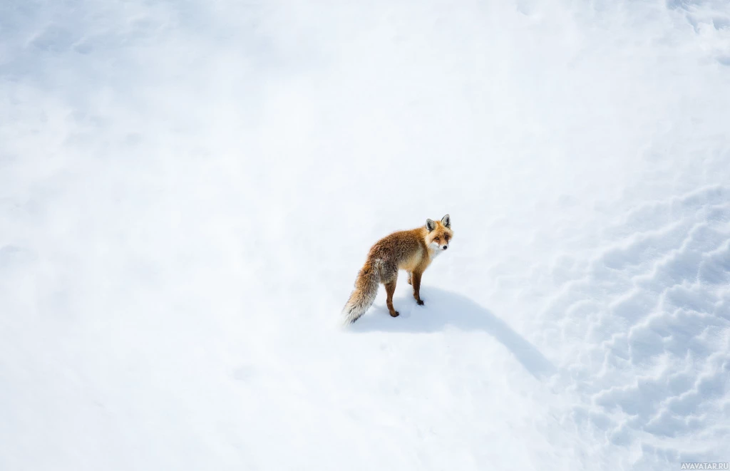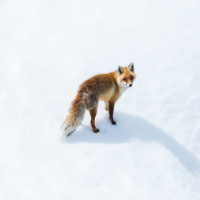 early spring when the ground remains covered with snow. The fox seems alert and is facing towards the camera, indicating that it might have noticed its presence.