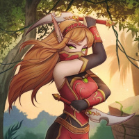 red hair and is wearing a detailed outfit that includes armor and a weapon, suggesting she might be a warrior or hunter in her fantasy world. Her expression is intense, with eyes focused forward, giving