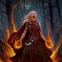 a dramatic pose or gesture, possibly casting a spell or engaging in some form of magic. They are surrounded by flames, suggesting the use of fire in their