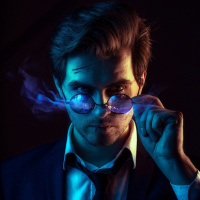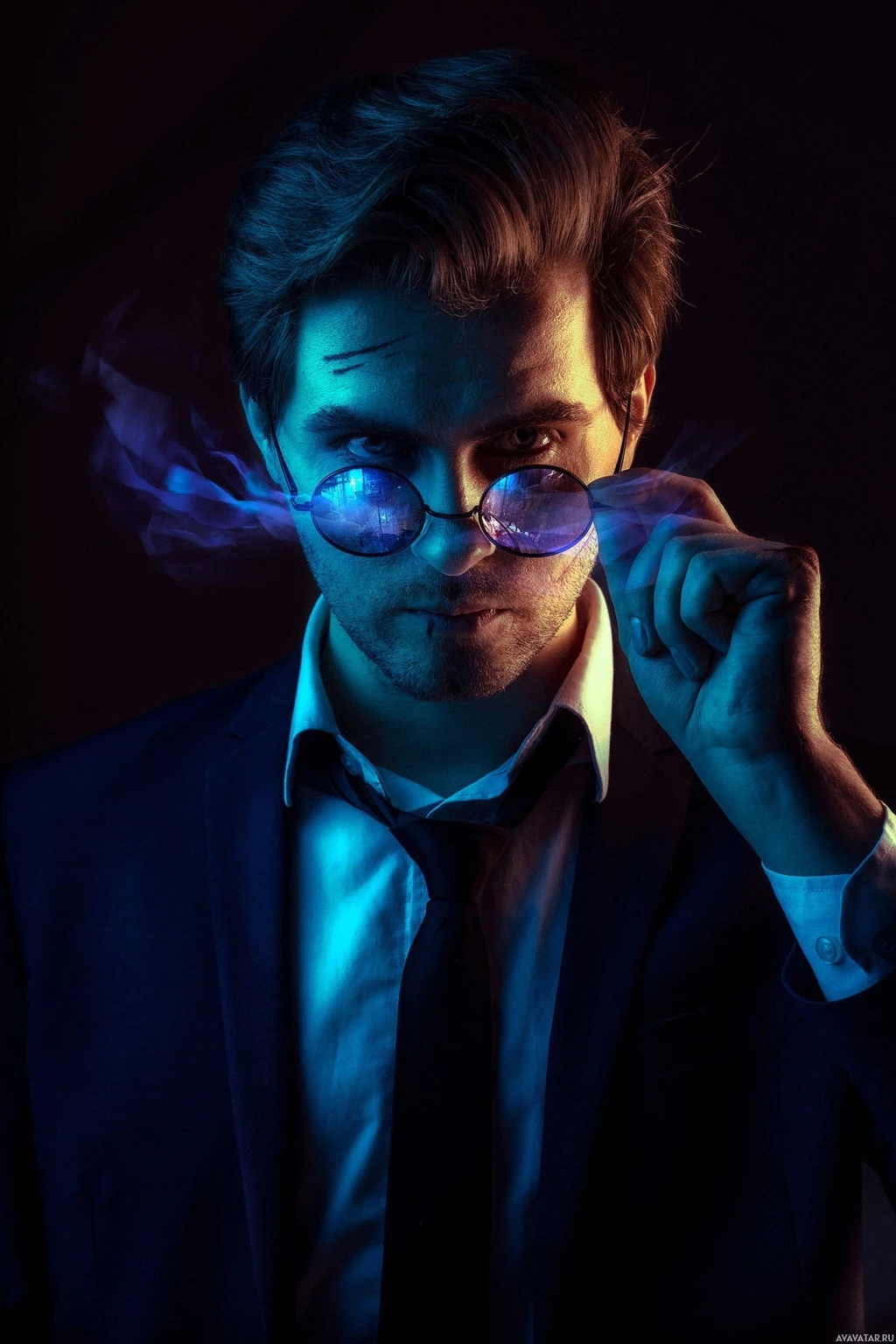 moody atmosphere that suggests it might be related to the character Daredevil, possibly portraying him in a cosplay or promotional context. The tie visible in the image aligns with