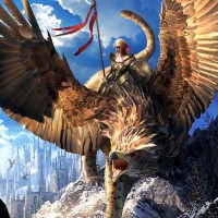 a fantasy scene featuring a young girl riding on the back of a griffon, which is a mythical creature with the body and wings of an eagle. The girl appears to be in armor, suggesting she might be a warrior or adventurer. The setting seems to be a rocky outcrop or cliff edge, with a clear