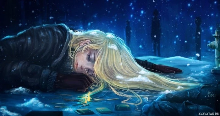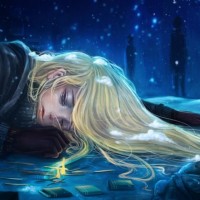 blonde hair, who appears to be in a dream-like or fantastical setting. She has her eyes closed and is leaning back as if she's experiencing a peaceful or ethereal moment. There are snowflakes falling around her, suggesting that the scene might take place during winter, perhaps after
