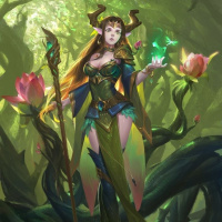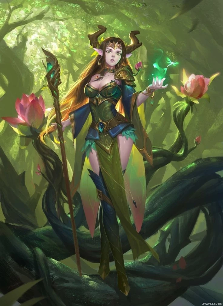 a fantasy character that resembles a dryad, which is a mythical being often associated with woodlands and trees. She has the appearance of
