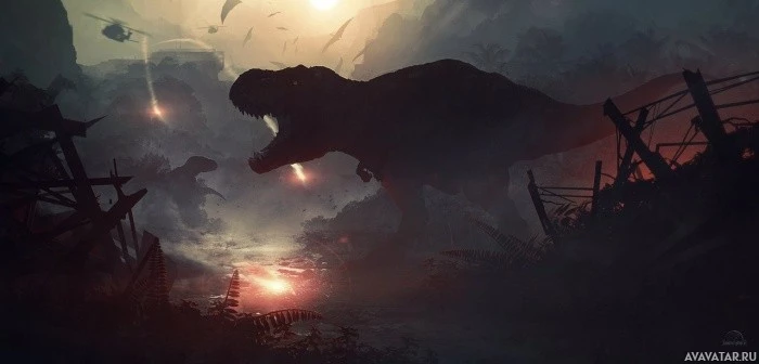 a silhouette of a dinosaur, specifically a T-Rex, amidst destruction. The setting looks like it could be the aftermath of
