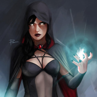 dark hair, and her outfit includes elements such as black lingerie, a cape, and what appears to be armor or bodysuit with spiky details. The character is holding her hands up near her chest, emitting