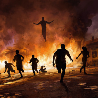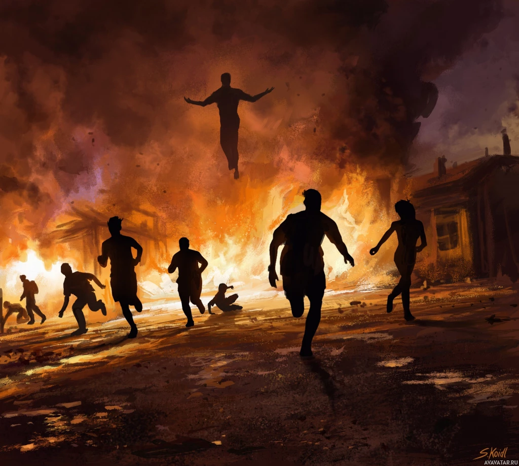 a dramatic scene with silhouetted figures running from what appears to be a fiery explosion. The background is filled with fire and smoke, creating