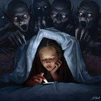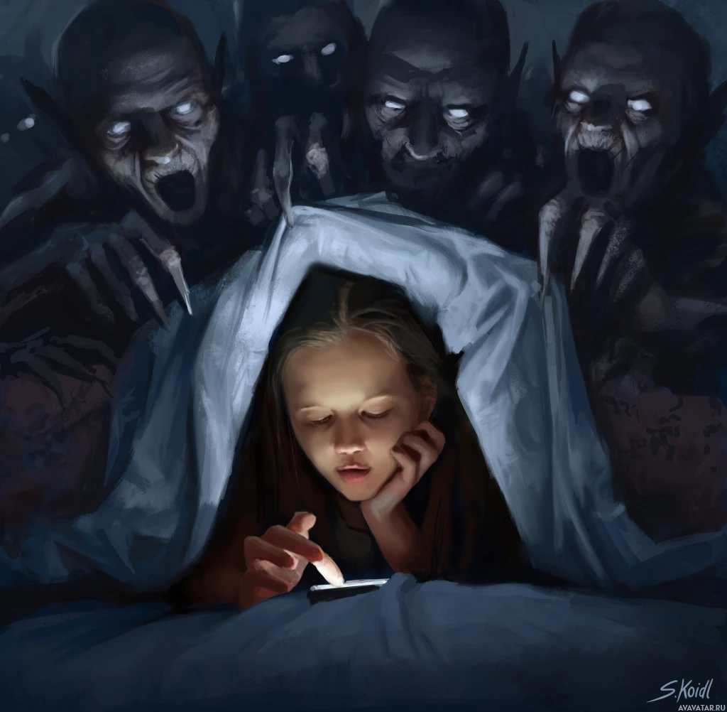 ghoulish figures that seem aggressive and menacing, reaching out towards her as if they want to harm or grab her. The setting is dark and ominous, with