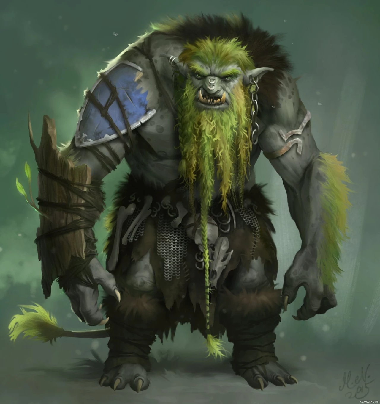 a fantasy character that resembles a troll. The creature is standing upright and appears to be very muscular with a greenish-grey complexion. It has long,