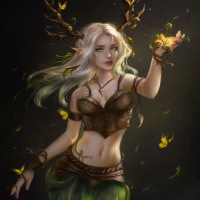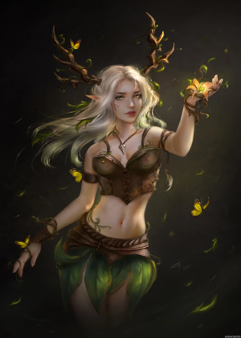 a female character with white hair and horns on her head, resembling those of a deer. She is dressed in a bodice that has leaves adorning it, and she appears to be made of foliage or composed of