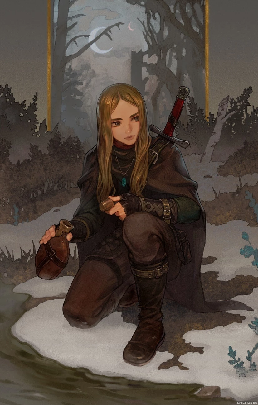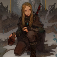 blonde hair. She appears to be dressed in medieval or fantasy-style clothing and is holding what looks like