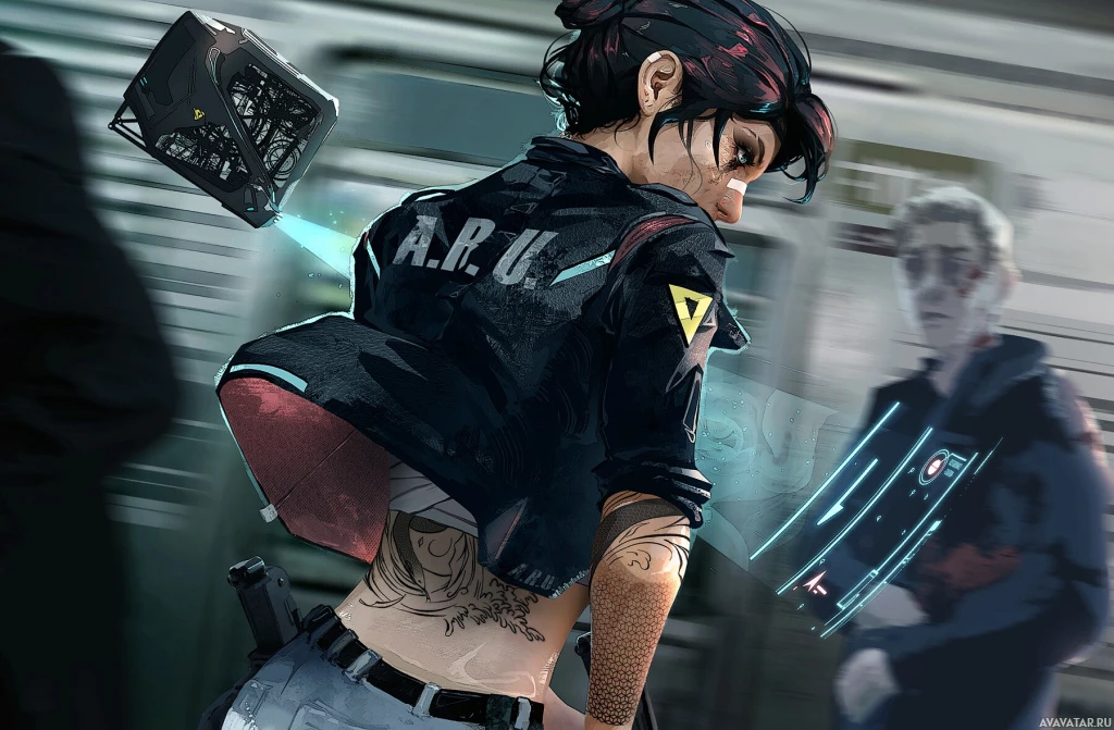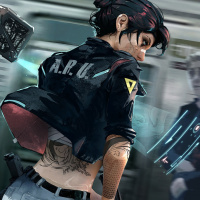 a black jacket with the word "ARC" printed on it, suggesting she might be part of an organization or group related to this acronym. She has visible tattoos and what seems to be a badge or emblem pinned to her left side. The character is drawn in