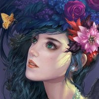 blue hair, wearing a large floral headdress that appears to be adorned with various flowers and foliage. The character also has
