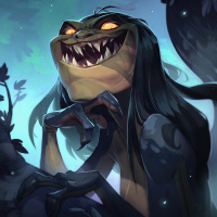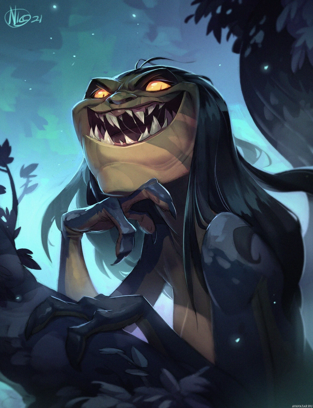 a fantasy creature that appears to be a blend of human and reptilian features. This creature has prominent fangs, eyes reflecting red light or energy, and is shown with