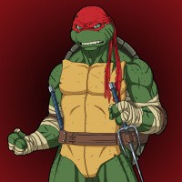 The image features an illustration of Raphael, one of the Teenage Mutant Ninja Turtles. He is depicted with his signature red bandana around his head and is holding a weapon in each hand. His expression seems intense or serious.