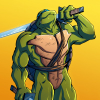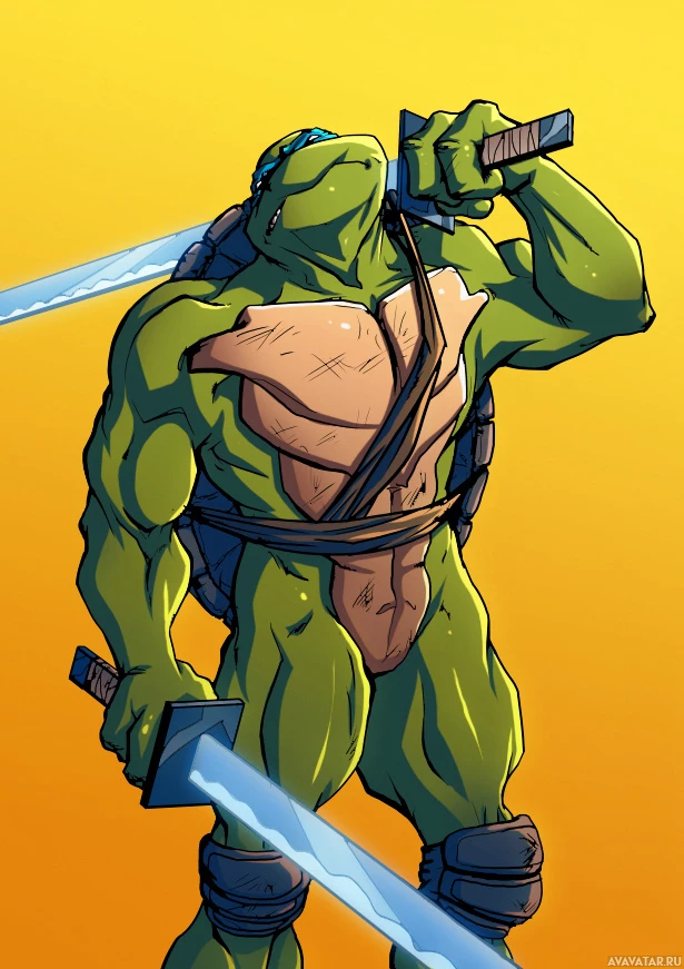 ninja outfit with two swords crossed at his back. Leonardo is known for his leadership, bravery, and skilled use of swords and
