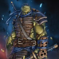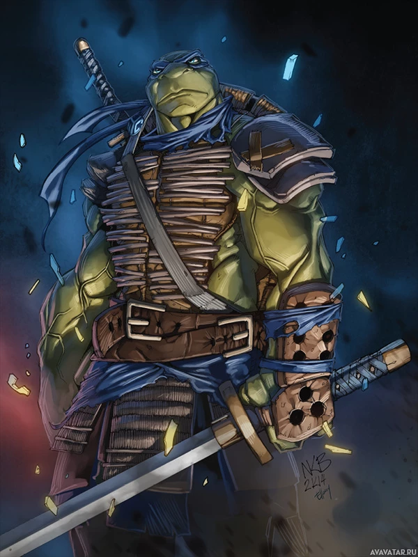 The image depicts an illustrated character resembling Leonardo from the Teenage